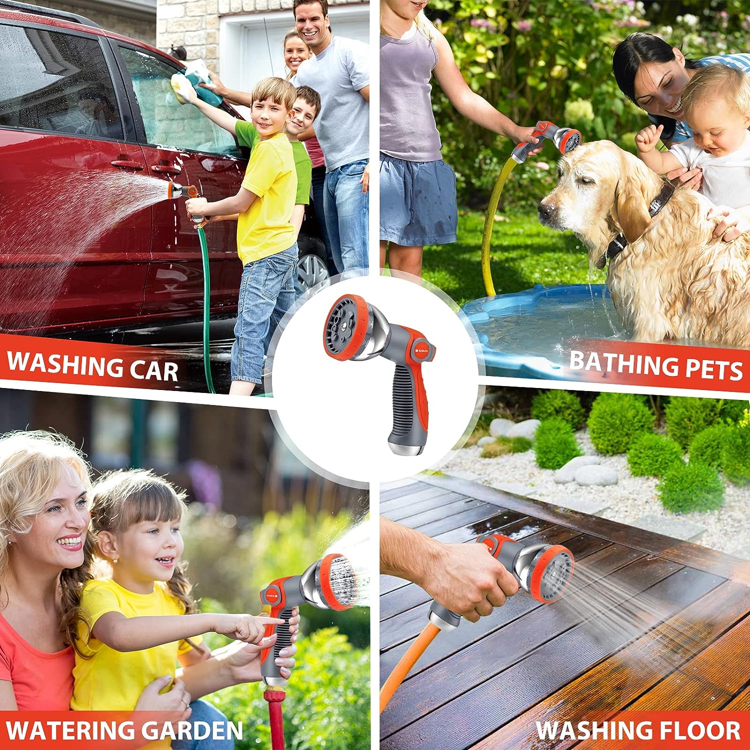 Garden hose spray has 10 adjustable hose head patterns: Center, Full, Flat, Cone, Angle, Shower, Mist, Jet, Rinse, and Soaker. Choose from a high pressure jet to a soft delicate shower. Ideal for cleaning house, car wash, watering plants, flower beds, soaking the soil, and bathing pets.