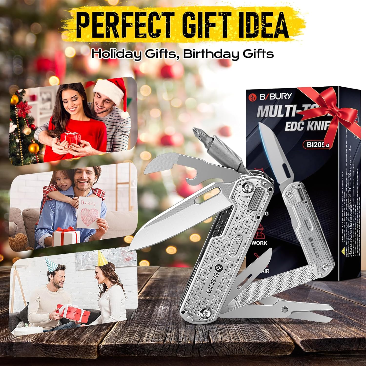 - 12-in-1 Multitool EDC Knife: The BIBURY multitool pocket knife combines 12 essential tools in one compact design. It includes a slotted screwdriver, phillips screwdriver, scissors, awl/thread needle, bottle opener, can opener, knife, file, glass breaker, tweezers and a convenient pocket clip. Perfe c t for any outdoor adventure, DIY tasks, or emergency situations